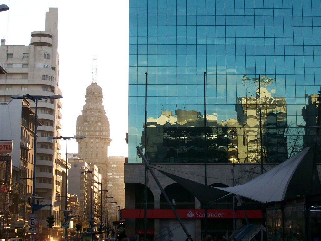 The view of 18 de Julio Street in Montevideo, with Salvo Palace as background. The Salvo was designed by the Italian architect Maria Palanti and opened in 1928. The same architect also projected a brother – building in Buenos Aires – the Barolo Palace, in Mayo Avenue, which is very similar to the Salvo Palace.